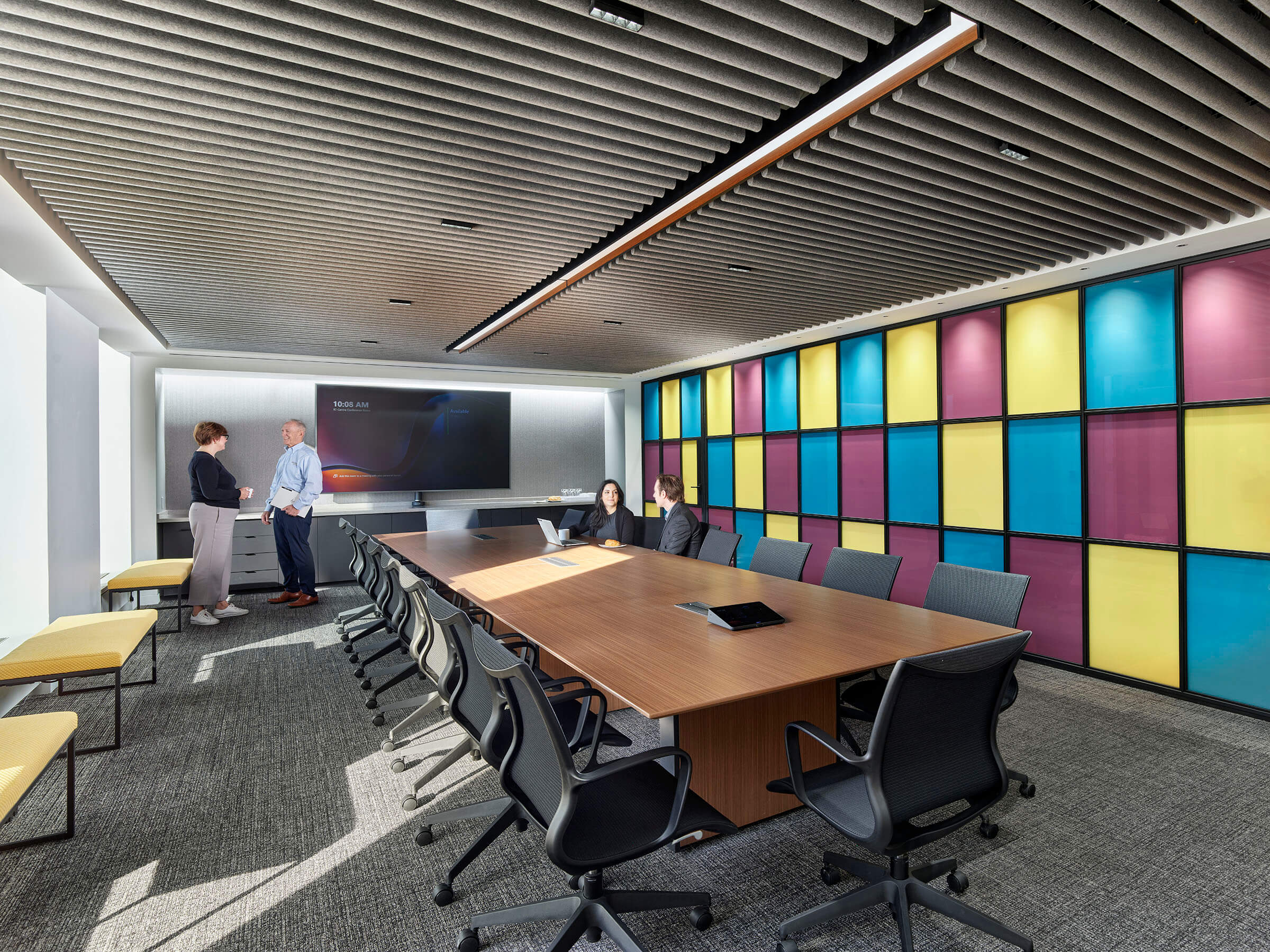BEAM worked alongside the architect to deliver a vibrant, modern workplace for Ardent Credit Union’s Headquarters. Large interior dividers constructed of multi-colored glass are flanked with adjustable accents, to allow a warm glow to be seen from both the reception and conference room. A linear downlight, transitioning seamlessly from recessed to pendant, runs along the entire main circulation, illuminating the walls and guiding employees through the space.