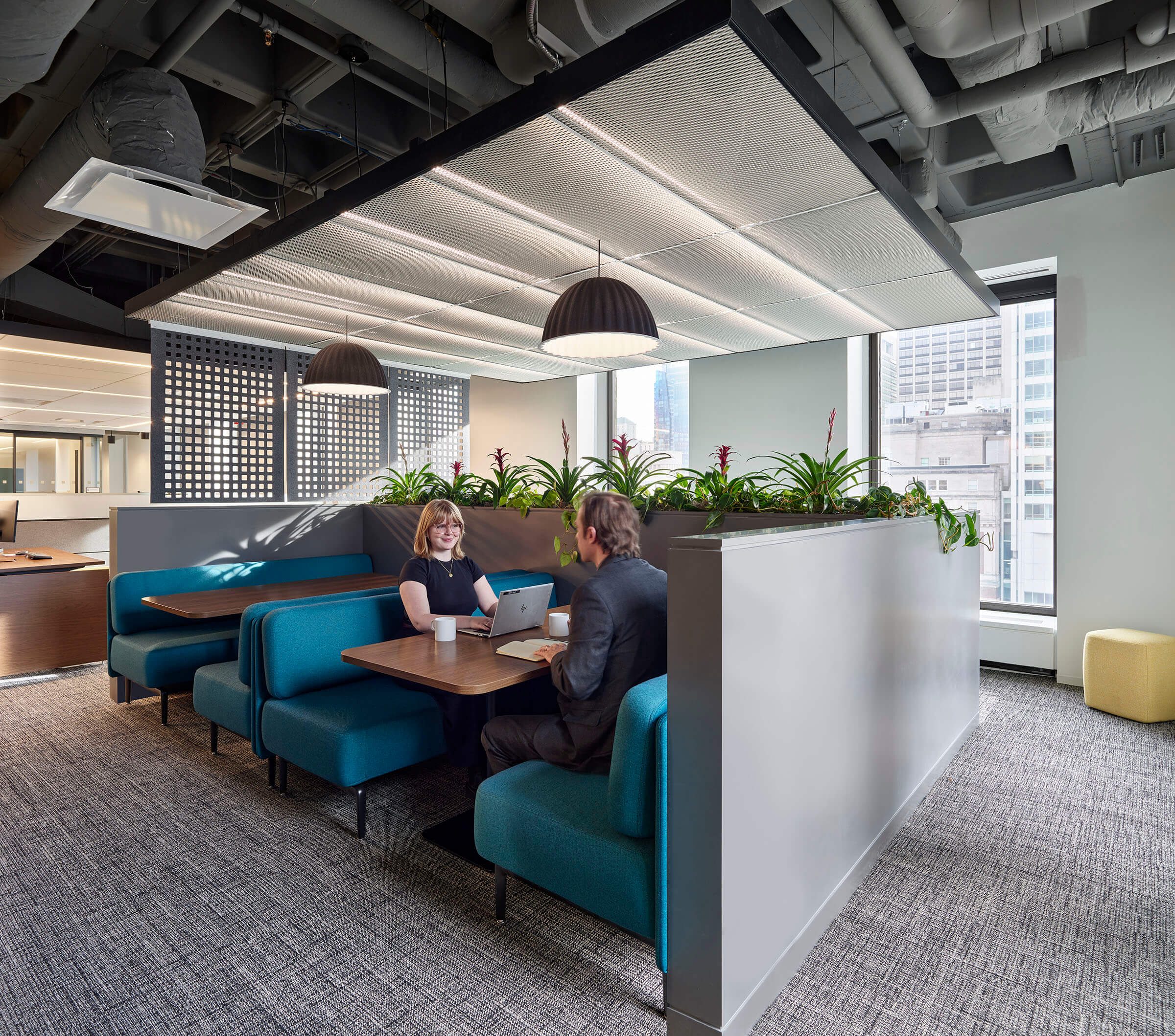 Various lighting solutions are integrated into ceiling elements to form their purpose; recessed linear downlights in rectangular configurations in floating grid ceilings above work zones; pendants and linears at mesh ceiling panels create a fun play of light and material for collaboration and lounge areas; and small aperture downlights and central pendant illuminate the main conference room.